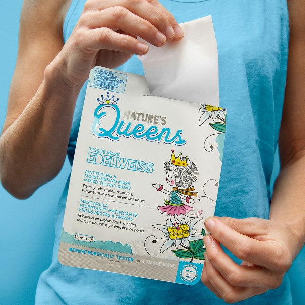 Masque Matifiant Nature’s Queens. Le masque en tissu est fabriqué à partir d’un tissu innovant en coton et en fibres de fruits, imprégné d’un sérum concentré en actifs hydratants naturels, particulièrement adapté aux peaux plus sensibles et abîmées. Pour peaux mixtes à grasses.